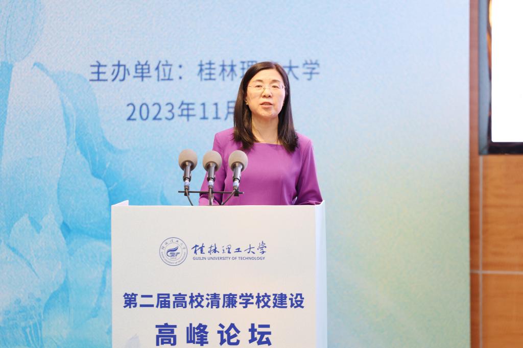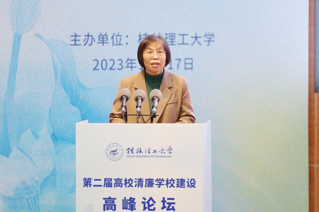 自治区纪委监委驻教育厅纪检监察组副组长、一级调研员李楠,华南理工大学党委副书记、纪委书记徐国正,广西大学党委副书记、纪委书记金顺南,广西师范大学党委副书记、自治区纪委监委驻广西师范大学纪检监察组组长莫坷,自治区纪委监委驻广西医科大学纪检监察组组长、广西医科大学党委常委韦敏观,南宁师范大学党委常委、纪委书记李美清,贺州学院党委常委、纪委书记袁胜军,桂林旅游学院党委副书记、纪委书记蒋峰华,桂林师范高等专科学校党委委员、纪委书记刘先锋,以及华南理工大学、广西医科大学、桂林电子科技大学、南宁师范大学、桂林医学院、贺州学院、桂林航天工业学院、桂林旅游学院等高校纪检监察部门领导受邀出席本次论坛。我校在家校领导邓军、王敦球、吴志强、周国清、韦学敏、王磊、黎贞崇出席论坛。学校“清廉桂工”建设领导小组各工作组组长,各二级学院党委书记、纪委书记,相关职能部门处级干部、正科级干部参加论坛。