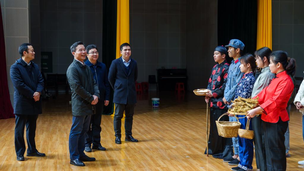 韦学敏在现场听取了公共管理学院主要负责人关于舞台剧拍摄情况的汇报,并一同观看了舞台剧拍摄,对《村里来了菩萨兵》舞台剧的廉政教育和文化育人成效寄予厚望。他强调,制作组人员要认真打磨,注重细节,提升作品质量,立足地方特色和优势,整合资源,打造品牌,不断创作出更多更好的廉政文化作品,为推动全面深化清廉桂工建设作出新的更大贡献。