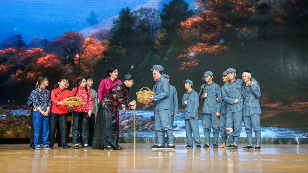 《村里来了菩萨兵》舞台剧是根据一九三零年红七军北上经过全州真实历史故事改编而来,公共管理学院编剧团队深入全州大西江与会龙铺进行调研访谈挖掘素材,走访民间并结合史料还原出红七军下全州的感人事迹进行编排导演,还原了红军长征途中有组织、有纪律、不取百姓一分一毫的场景,展现了共产党廉明清正的良好形象。