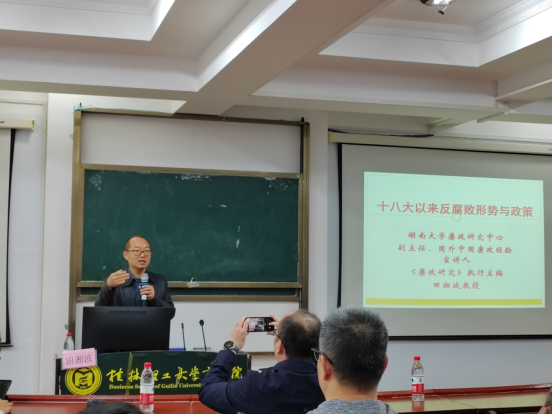 田湘波教授从“如何看党的十八大前后中国的腐败形势、十八大以来反腐的成就与政策、当前反腐败面临的困难和挑战、未来廉政建设之路该怎么走”四个方面展开论述。讲座内容系统全面、内涵丰富、案例详实。