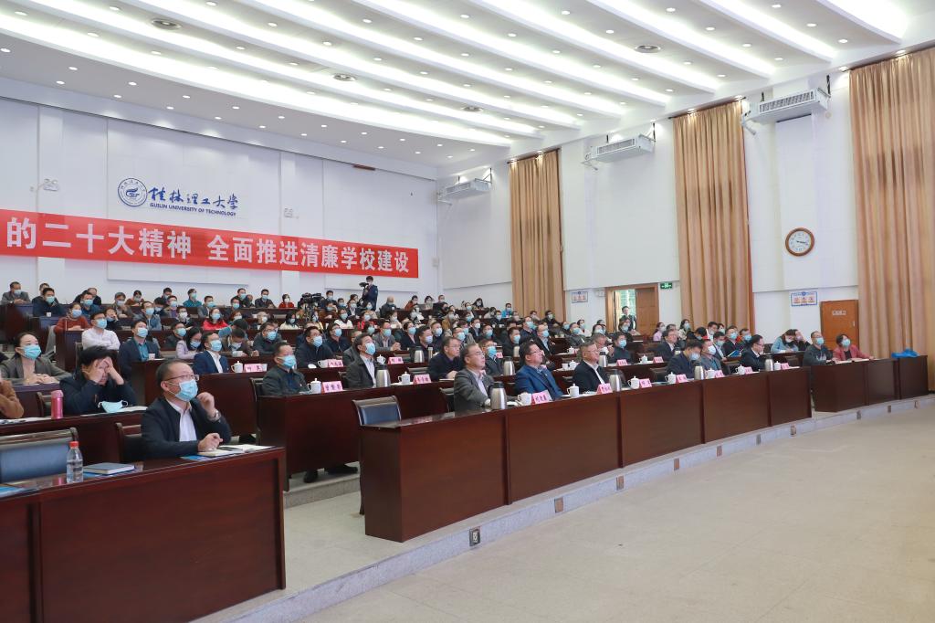 为深入学习贯彻党的二十大精神,贯彻落实自治区党委、自治区党委教育工委、自治区教育厅关于“清廉广西”“清廉学校”建设的部署要求,研讨交流清廉学校建设方面的好经验好做法,助力各高校打造清廉教育高地,全面营造风清气正的政治生态和良好的育人环境,11月18日,我校在屏风校区图书馆报告厅举行高校清廉学校建设高峰论坛。本次论坛以“学习贯彻党的二十大精神 全面推进清廉学校建设”为主题,通过线上线下相结合的方式进行。