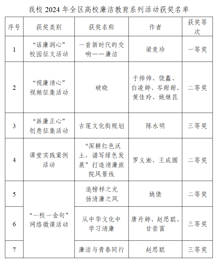 近日,自治区党委教育工委发布《关于公布2024年全区高校廉洁教育系列活动评选结果的通知》(桂教工委组〔2025〕1号),我校选送的作品在全区高校廉洁教育系列活动评选中共获各级奖项7项,其中:选“话廉润心”校园征文一等奖1个,“视廉清心”视频征集二等奖1个,“画廉正心”创意征集三等奖1个,课堂实践案例二等奖1个,“一校一金句”网络微课二等奖1个、三等奖2个。