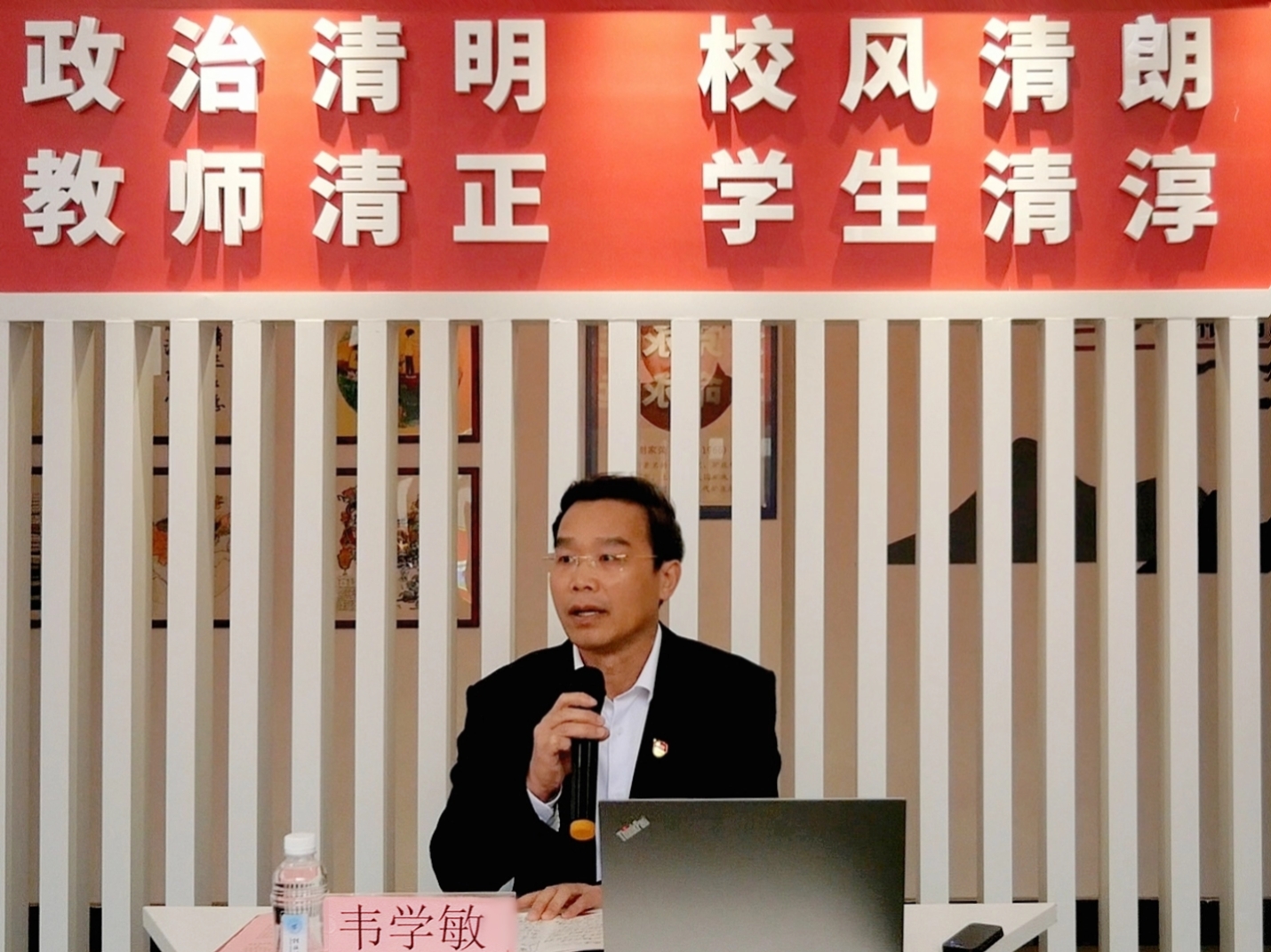 韦学敏对地球科学学院清廉建设工作表示肯定,对地球科学学院廉政文化长廊创造性、创新性、示范性的模式打造给予了高度评价,并在廉政文化长廊为在场师生讲授了一堂别开生面的“沉浸式”现场主题微党课。党课上,韦学敏以《领悟“两个答案” 捍卫“两个确立” 做到“两个维护”  紧跟伟大复兴领航人踔厉笃行,全面推进中华民族伟大复兴》为题,深入阐释了习近平总书记关于清廉文化建设的重要论述,重温了历史上毛泽东与黄炎培著名的“延安窑洞对”,讲述了如何跳出治乱兴衰的历史周期率。韦学敏指出,毛泽东同志在延安的窑洞里给出了第一个答案,这就是“只有让人民来监督政府,政府才不敢松懈”。经过百年奋斗特别是党的十八大以来新的实践,习近平总书记又给出了第二个答案,这就是自我革命,我们要在实践中正确领悟人民监督和自我革命之间的辩证关系,充分发挥两大答案的独特优势。“党的自我革命”是习近平总书记对中国共产党跳出历史周期率实践探索的最新概括,是习近平新时代中国特色社会主义思想中具有标识意义和原创性贡献的重大科学论断,具有重要的理论价值和实践意义。